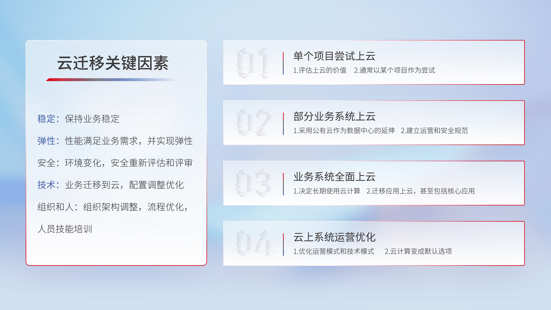 结合实际业务,,,,从规划设计、、云平台选型、、、、云原生改造、、数据迁移、、、集成交付,,,,迁移全过程为客户识别最佳上云路径,,做好风险识别管理,,设计网络架构、、身份权限、、、、安全审计合规、、、操作审计、、、、日志审计、、、监控告警策略、、多站点容灾设计等,,,,对云上基础设施进行整体规划,,提升IT治理水平,,,,以满足弹性、、、高可用、、高性能的需求。。。