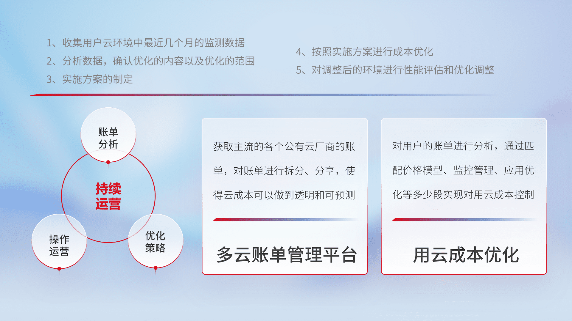 通过多云纳管,,,以统一的资源数据模型把客户的云资源进行抽象和封装,,,进而实现对多云资源的统一操作,,,保障云资源管理的可靠性、、、稳定性与可用性。。。。量身定制化运维内容,,,,配置、、、、开发运维、、补丁管理、、备份、、、、监控、、、、认证和访问管理、、、审计和日常巡检等,,保障在用云过程中的可靠度,,稳定度以及高可用率。。。。